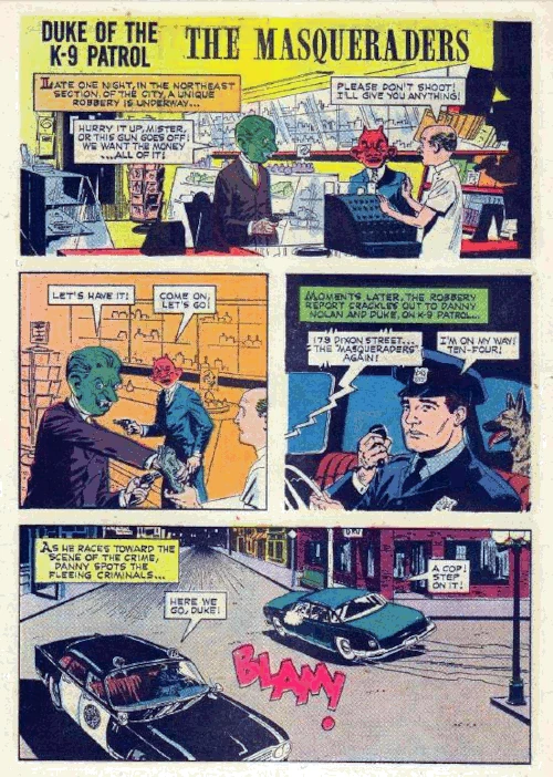 Can the city council be convinced to keep the K-9 program in place? Will a police dragnet stop the Masqueraders before one of their robberies turns lethal? Has Duke caught the scent of one of the perpetrators? Collect the series to find out!