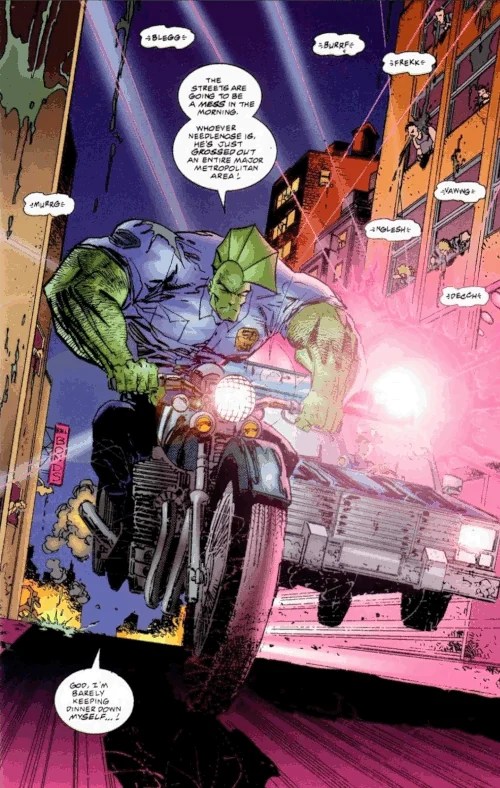On the rough streets of Chicago blood and puke spill from the innocent as a group of rogue “freaks” begin a terrorism campaign! Will the city’s finest peace officer, Savage Dragon, be able to stop the flow of chunks?